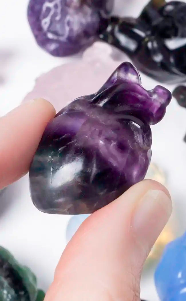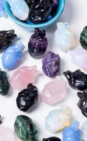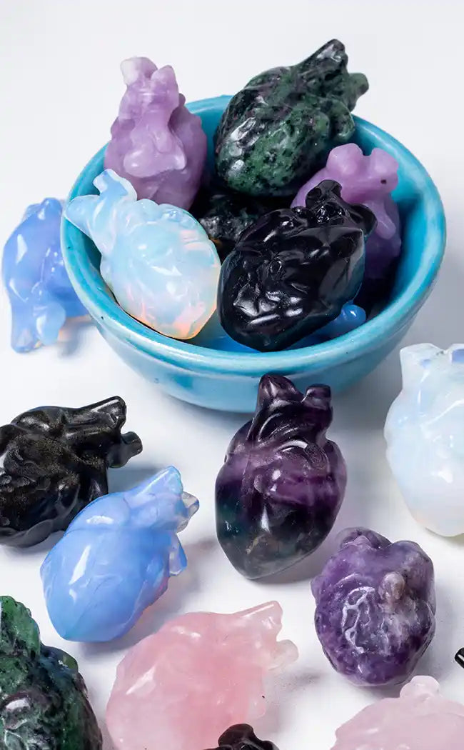 These beautifully polished mini heart crystals feature intricately carved details that make for a unique manifestation tool. Your heart will be intuitively picked from a selection of crystals including opalite, clear quartz, rose quartz, obsidian, blue aventurine, fluorite, blue opalite, labradorite, zoisite, amethyst and more.