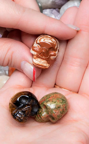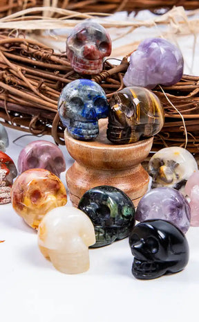 Add to your crystal collection with one of our macabre, glittering crystal skulls. These beautifully polished crystals feature intricately carved details that make for a unique manifestation tool. Your skull will be intuitively picked from a selection of crystals including sunstone, black tourmaline, lepidolite, sodalite, and more.
