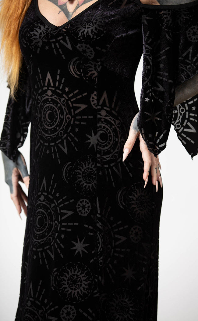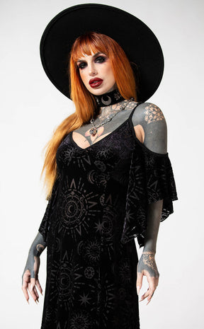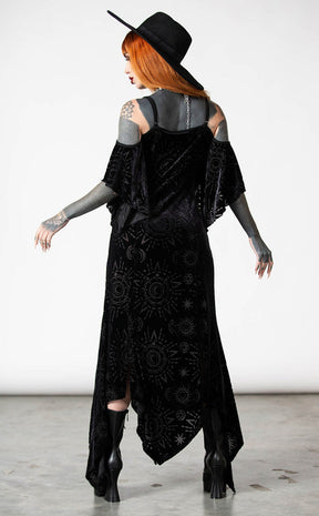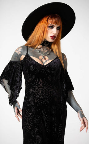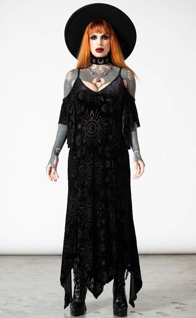 Dress to distress in the hauntingly beautiful Crystal Spirit Burnout Maxi Dress! The soft, stretch velvet features a wicked burnout pattern, forming a bardot neckline, a hanky hem and a flattering A-line silhouette.