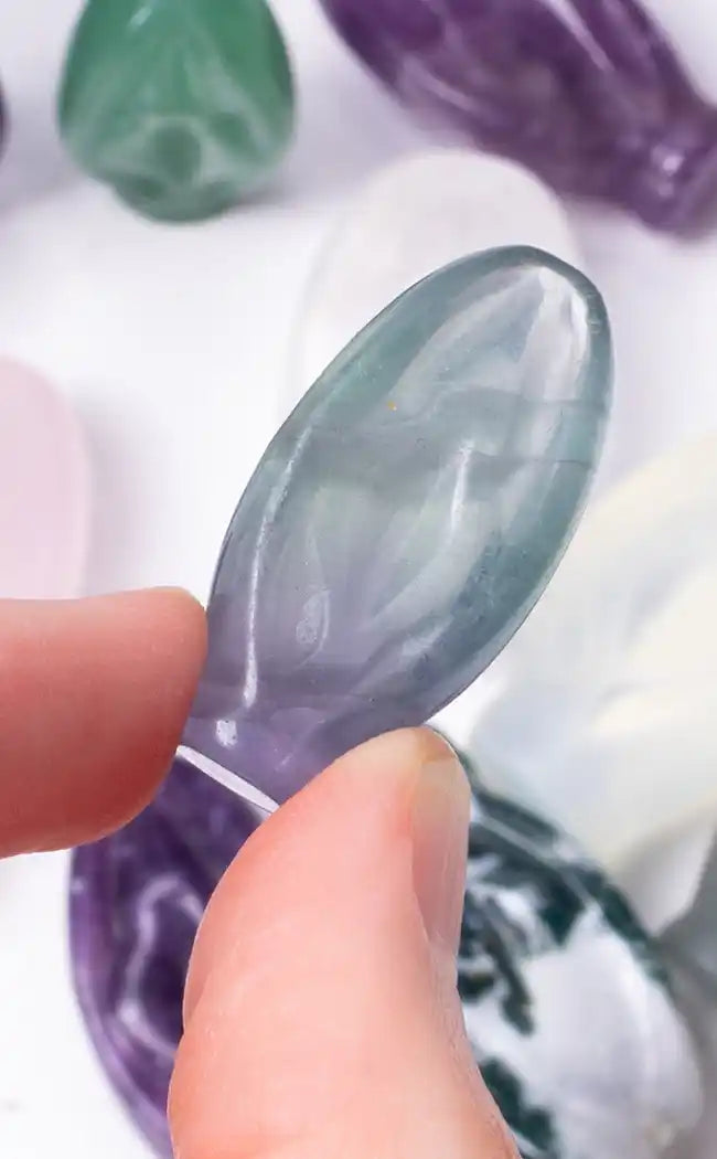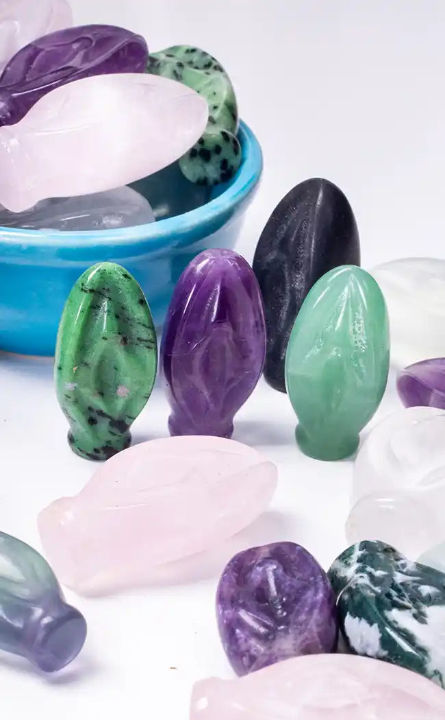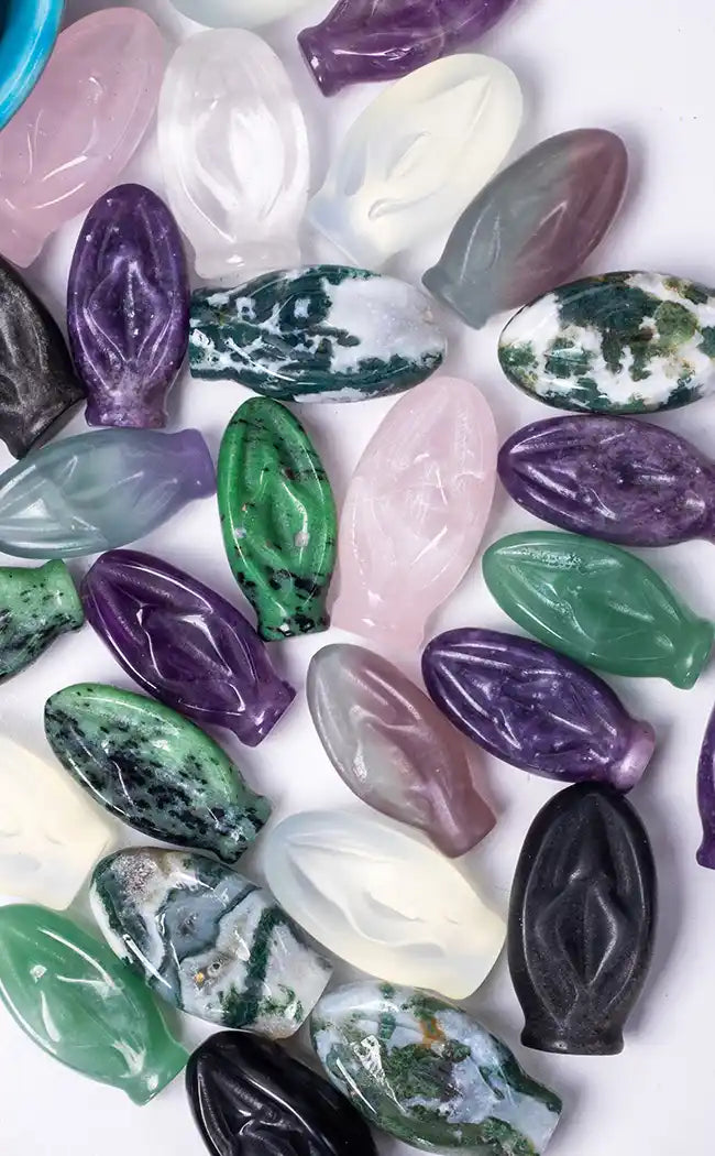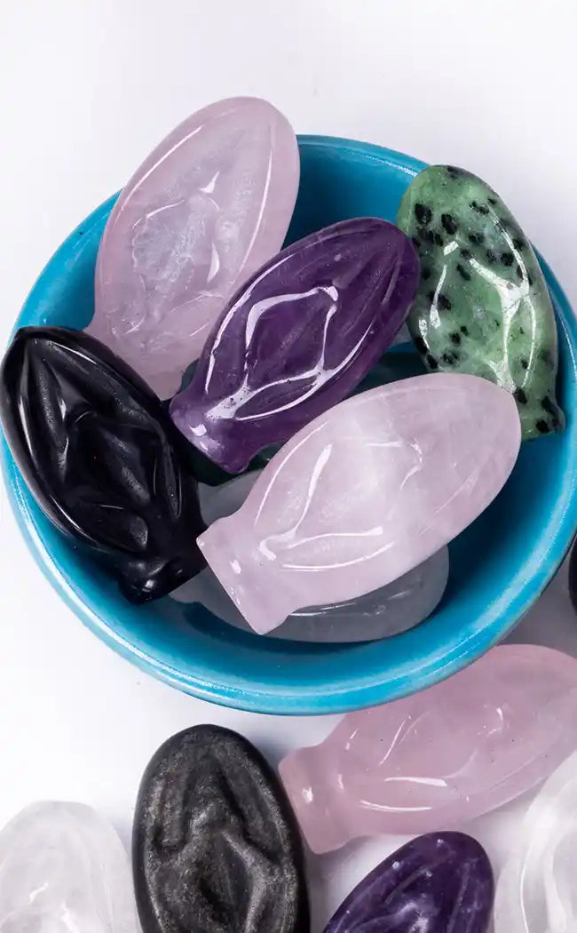 These beautifully polished mini vulva crystals feature intricately carved details that make for a unique manifestation tool. Your yoni will be intuitively picked from a selection of crystals including rose quartz, pink opalite, aventurine, moss agate, lepidolite, dream amethyst, fluorite, silver obsidian, blue goldstone and more.