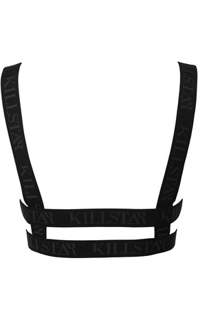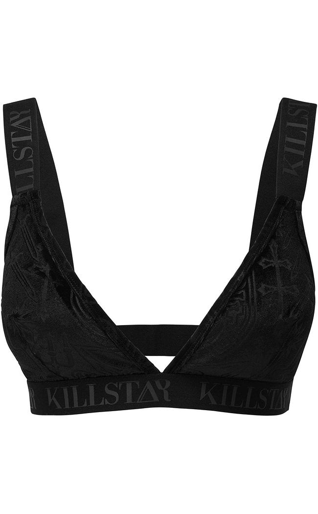 The Cultus bralet is so soft and comfy it should be a sin. Embossed elastic straps sit securely over your chest, forming a statement strap on the chest and cage look across the back. The velvet is embossed with occult symbols for extra wicked energy.