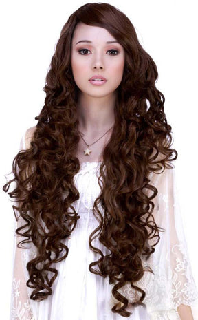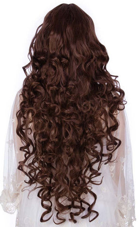 Gorgeous long flowing brown curls that are 36" long! Not only does it look great out of the bag, but its long curls and swept bangs can be pinned, braided, or styled into any hairstyle you could possibly imagine!