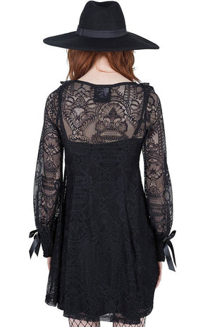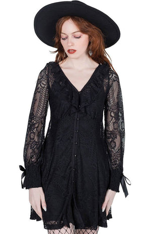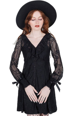 Step out of the mists in stunning lace and frills. The Cybele dress has a button up front leading to a deep v neck. The long, lace sleeves are secured by elasticated cuffs and bows to create a feminine puff while the whole affair is trimmed in ruffles to die for.