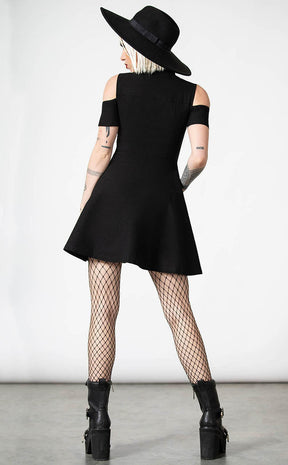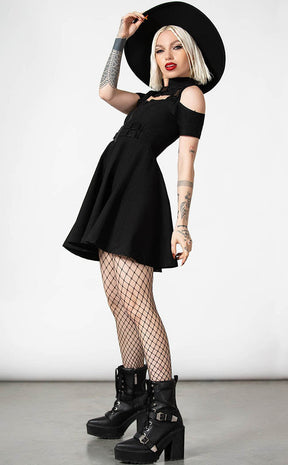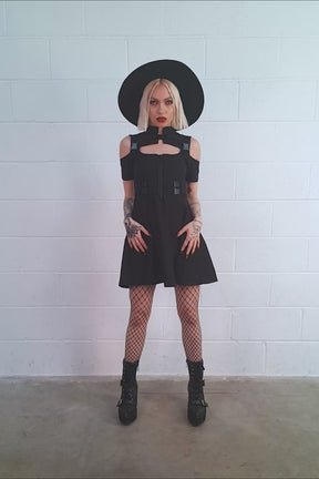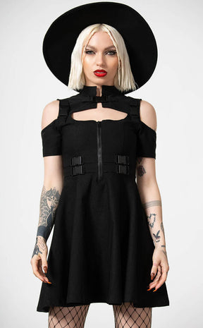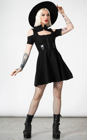 Leave 'em stunned in the Cybermancy Zip Skater Dress! This futuristic cutie is made with soft, stretch fabric that forms an A-line silhouette with a high neckline, seam detailing, cutout shoulders and a cutout yoke. Wicked cyber deets like buckles on the collar, shoulders, and waist will have ya feelin' badass along with the front zip.