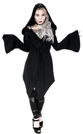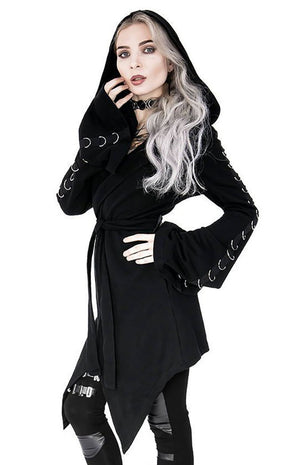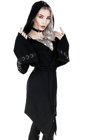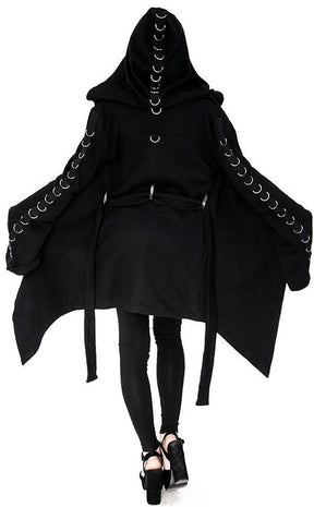 D-Rings run a line down the arms, hood and upper back of this hoodie in a simple yet eye-catching design. Super versatile and wearable, this hoodie creates flatters the figure with its long length ending in points and cinching at the waist with a tie. The thick cotton keeps you warm and the spacious hood sits witchily over the head and drapes over the shoulders.