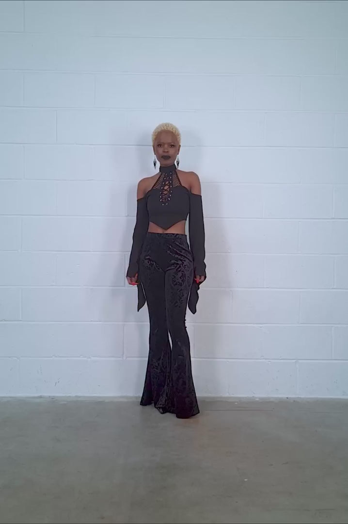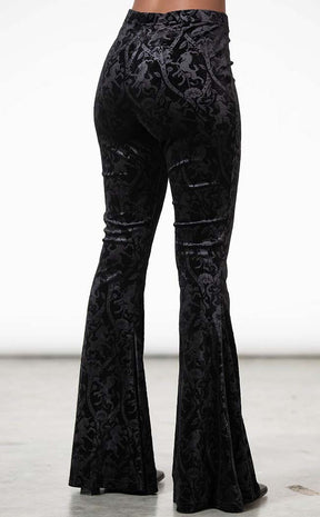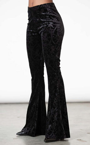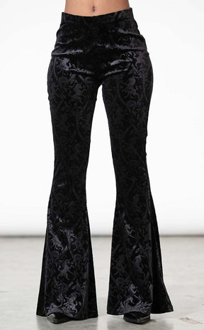 The Dark Dynasty Flares will have you looking like a wicked sorceress! Soft, stretch velvet is embossed with a statement beast motif, forming into flowing flares, a high waistline and a comfortable elastic band.
