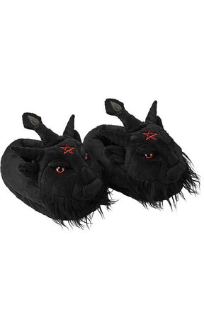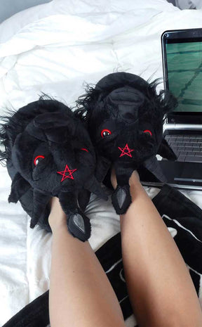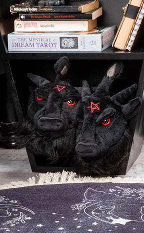 Worship the art of darkness and comfort in the Dark Lord Slippers! These sinfully adorable slippers are ridiculously plush and soft, keeping you warm as you stomp around the house. The front is shaped after Killstar's iconic Dark Lord creature, featuring red eyes, embroidery, faux fur and horns.