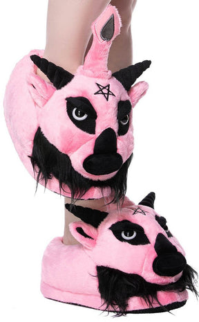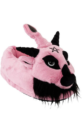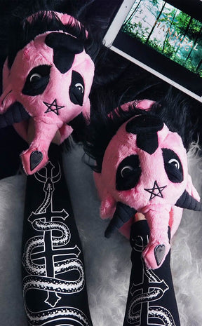 Your favourite OG Kreepture-now in tooth rotting bubblegum pink! Keep those tootsies warm and cosy with these crazy plush Baphomet slippers: contrasting black features around his eyes, nose and floofy beard as well as an inverted embroidered pentagram stand tf out on his pink fur. Now all you need is a warm cup of tea and someone warm to snuggle up with.