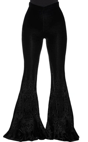These flares are all decked out in luxe velvet and a cathedral window motif for a classy retro look. these babies are loooong so you'd best wear them with your fave platforms to get the most outta that swish!