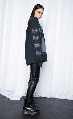 Turn your empty inside into a fashion statement with the Dead Souls Long Sleeve Tee. A large grey-toned print covers the front and sleeves of this tee, made with soft, durable cotton that forms a slouchy silhouette and a crew neckline to comfortably trap yer inner demons.