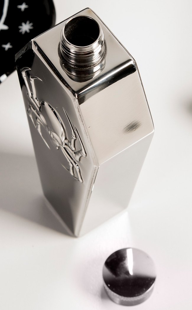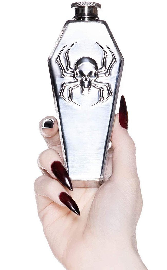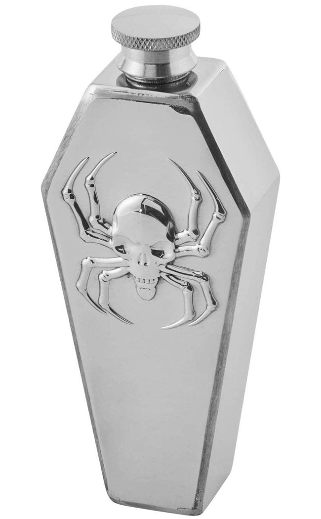 Stash yer poison for discreet imbibing! The unique flask is coffin shaped, topped with a deadly embossed spider. With a secure screw lid, you can sneak yer vodka, tea or venom while you're out and moving about by hiding it in your pocket, handbag or web of tricks!