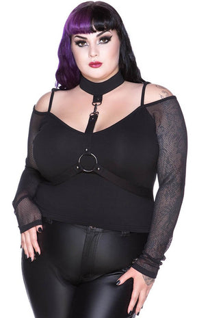 A kinky twist on yer classic fishnets! This unique blend of a bardot top and halterneck features a harness with an o ring sitting at the centre of the chest. With super stretchy and comfy fabric, this baby is easy to dress up or down.