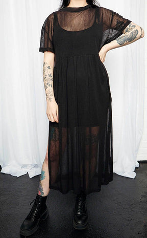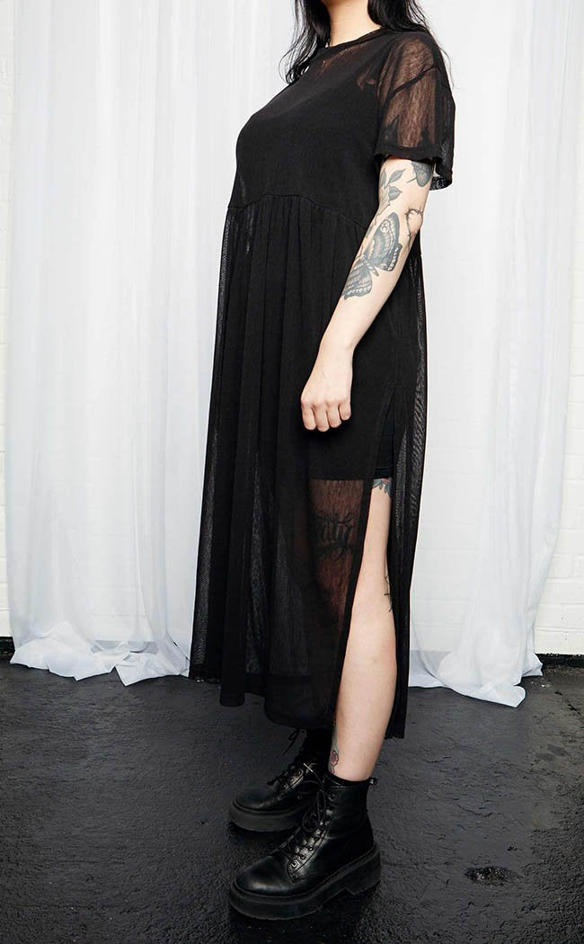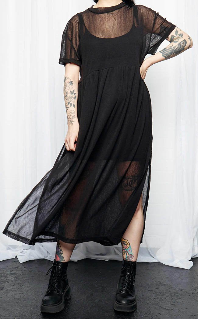 Become the shadow that goes bump in the night in ultra soft, sheer mesh that drapes beautifully down your bod. Coming with a built in stretchy slip dress, create a layered look that transitions between seasons as well as night and day. With sexy slits and a high neck, you'll be the most glamorous horror to tread the earth.