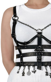 The Bruja Body Harness boasts an adjustable shoulder strap that guarantees a flawless fit for all wearers, delivering all-day comfort and security with ease. The decorative bat buckle centrepiece brings a bit of gothic charm, creating a striking impact that commands notice.