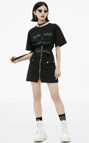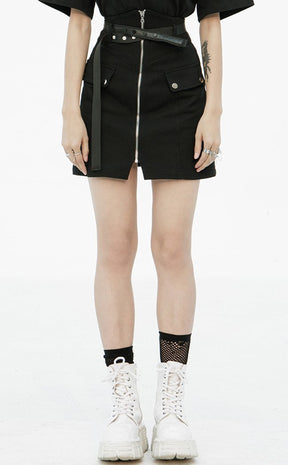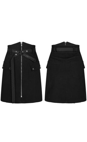 The body of the skirt is cut to a short length and sits high on the waist, shaping itself around and under the chest. The two vegan leather straps are fully adjustable and studded to hell and back ! It also fastens at the back with a zip for easy on/off.
