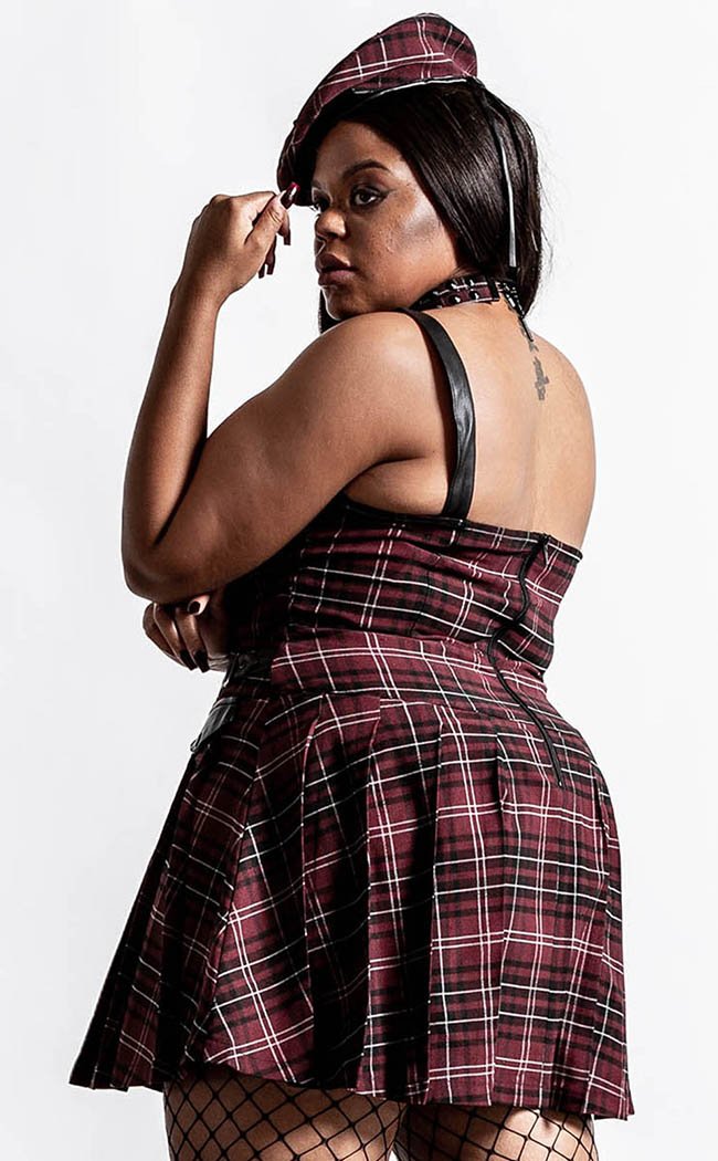 The Distortion dress has a sultry low neckline with a lace-up decal down the middle. Faux leather details like the statement shoulder straps, buckles, and pocket flaps will make you look at home in any rebel army.