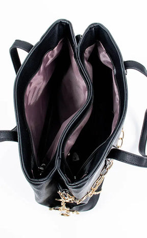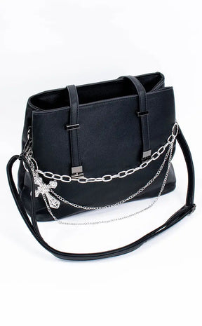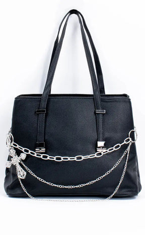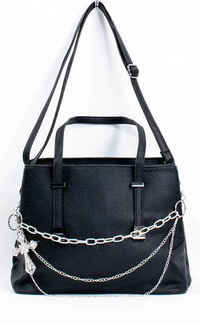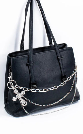 A timeless black leather handbag boasting glamorous silver accents on the zips and straps. Adorned with a shiny detachable chain and striking cross that can double as a keychain or belt chain.