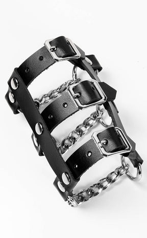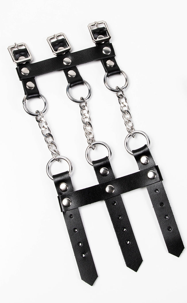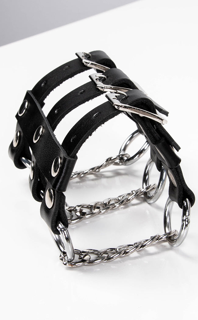 The Dopamine Wrist Harness is the metal af accessory to polish off any killer lewk. The cage look cuff is made up of 3 studded bands forming 3 buckled straps joined by silver O rings and chains.