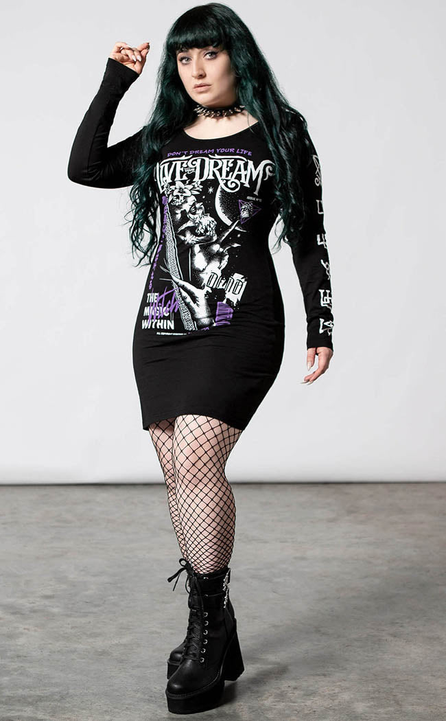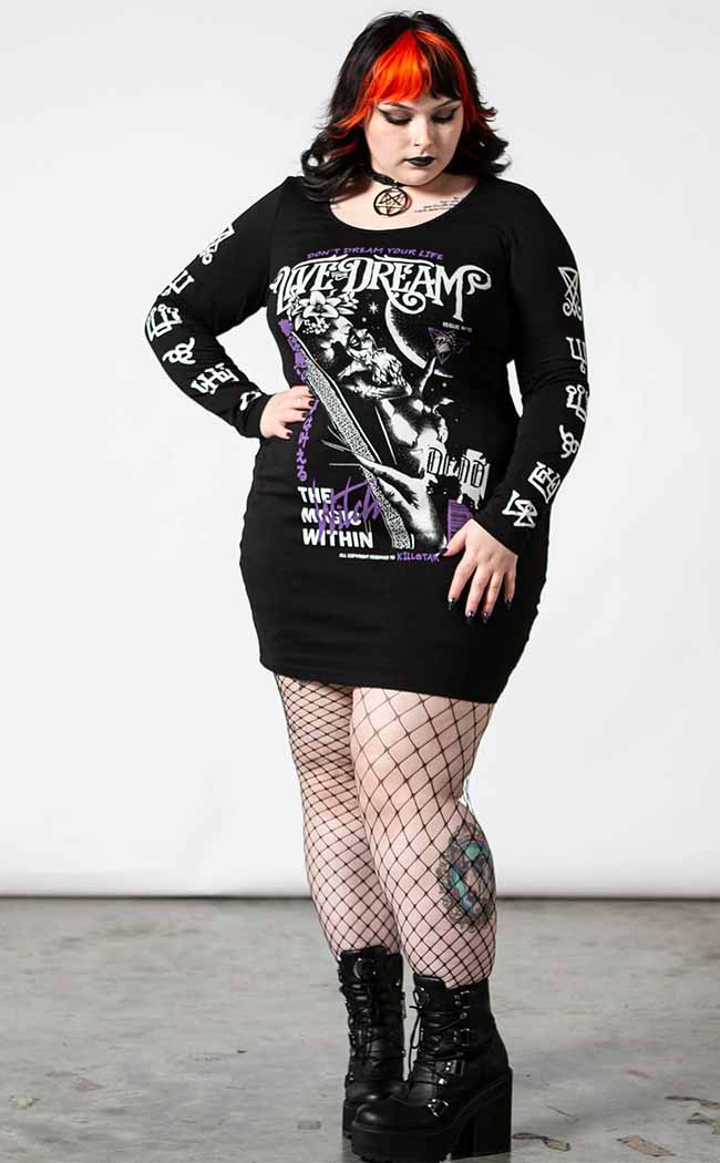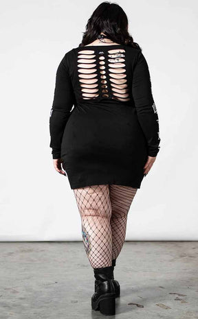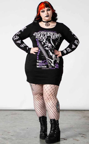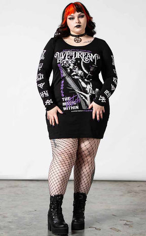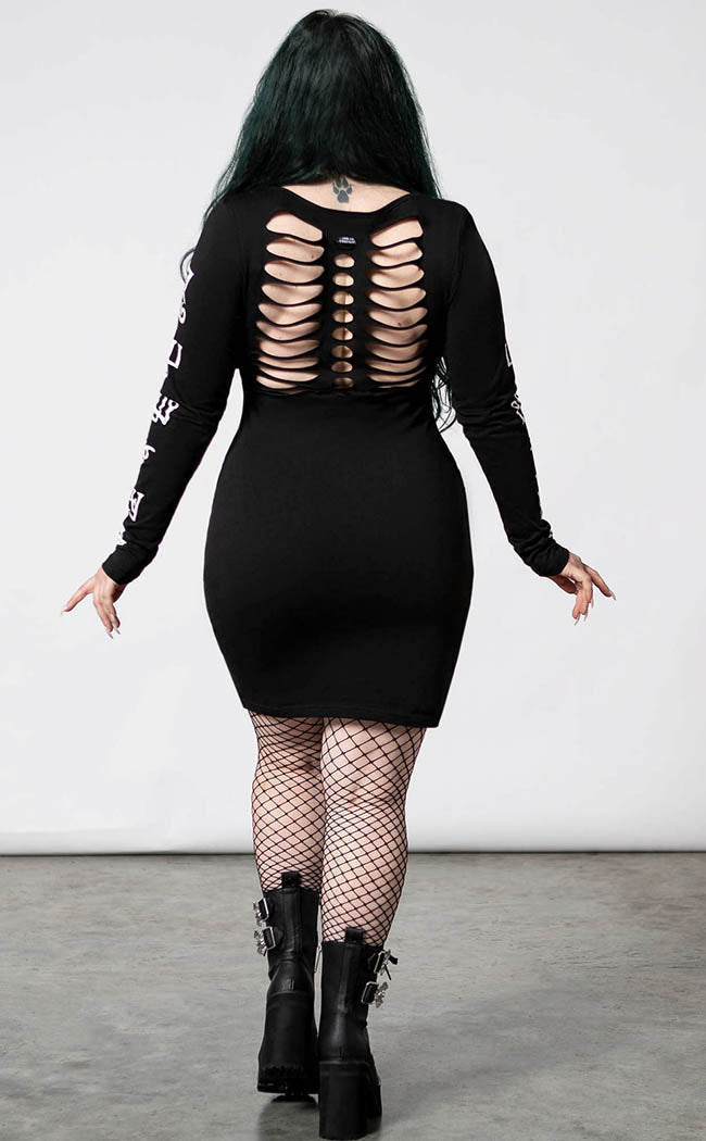 Bless their slumber in the Dream Slash Dress! This long-sleeve bodycon is made with a super soft stretch cotton jersey, featuring a round neck and fitted design to hug yer curves. The back features slashes to mimic yer spine for a bone tingling lewk while the front showcases a wicked graphic, complemented by the occult symbols on the arms.
