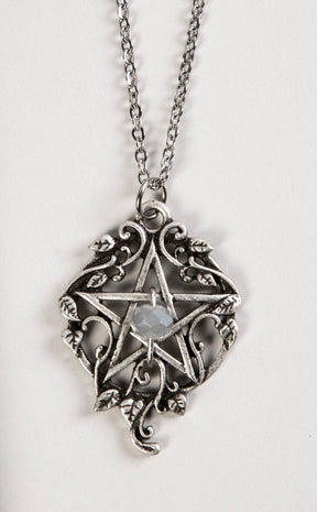 An upright pentagram forms this pendant, surrounded by filigree and touches of ivy as if plucked from an overgrown ruin. At the centre sits a smoky, grey bead for a touch of elegance formed from cool mists.