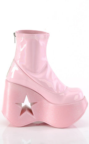 Baby, you're a star! The DYNAMITE-100 boots are ankle-length wedge boots made with comfortable stretch faux leather that secure with a rear zip. Perfect for club looks, festivals, or for when you're feeling just that little bit xxxtra.