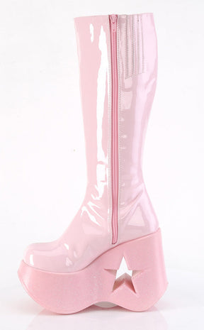 Baby, you're a star! The DYNAMITE-218 boots are knee-length boots with glittering star details to match the cutout in the wedge. The calf stretches and secures with a full-length inner zip.