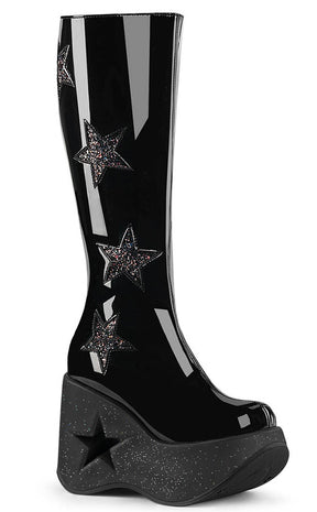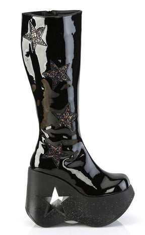Baby, you're a star! The DYNAMITE-218 boots are knee-length boots with glittering star details to match the cutout in the wedge. The calf stretches and secures with a full-length inner zip.