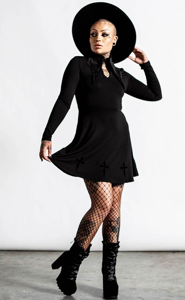Get in the vampire spirit with the Elissabat Collar dress! The exaggerated bat collar is the star of the show, sitting above a keyhole chest. The rest of the dress is a soft stretch fabric, featuring long sleeves and a skater length skirt trimmed with crosses.