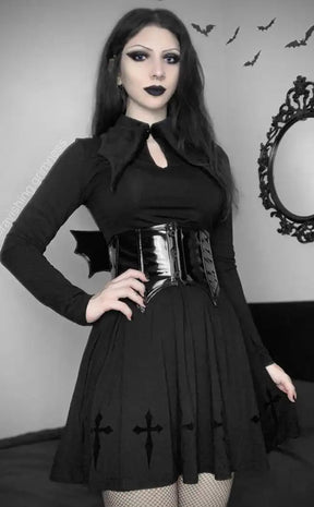 Get in the vampire spirit with the Elissabat Collar dress! The exaggerated bat collar is the star of the show, sitting above a keyhole chest. The rest of the dress is a soft stretch fabric, featuring long sleeves and a skater length skirt trimmed with crosses. Easy to dress up and down for any night haunt!
