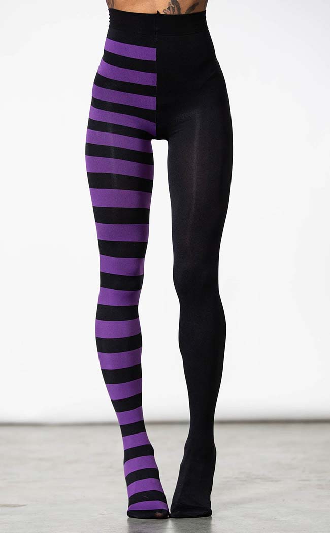 The Ella Tights are a unique combo of two pairs of tights in one: one striped leg and one fully opaque black leg.