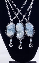 The pendant is a large rough celestite cluster, it has been encased in a handmade sculptured solder setting with sparkling rhinestones around the side and an aquamarine beaded detail with a rhinestone crescent moon and star charm hanging below. These pendants hang between approximately 4-6cm long each, from the top bail to the bottom of the fringe.