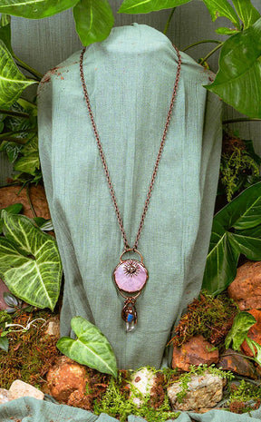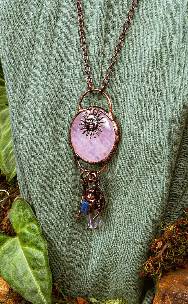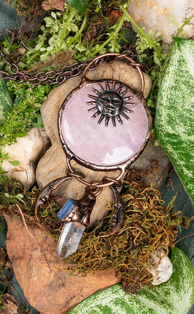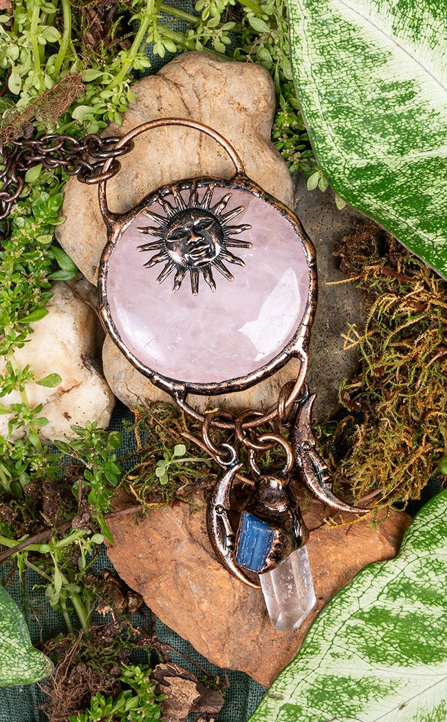 The Equilibrium Rose Quartz Crystal Necklace is made from a beautiful crystal that has been hand shaped into a large round pendant and polished. Each pendant has been framed in a handmade sculpted bronze setting with a sun affixed on the front. Below the main crystal, a smaller quartz crystal point hangs in a setting with a blue kyanite crystal. A pair of delicate crescent moon charms swing from either side. The necklace secures with a large arch and includes a 70cm long antique bronze chain. These necklaces are hand made and each is beautifully unique.
