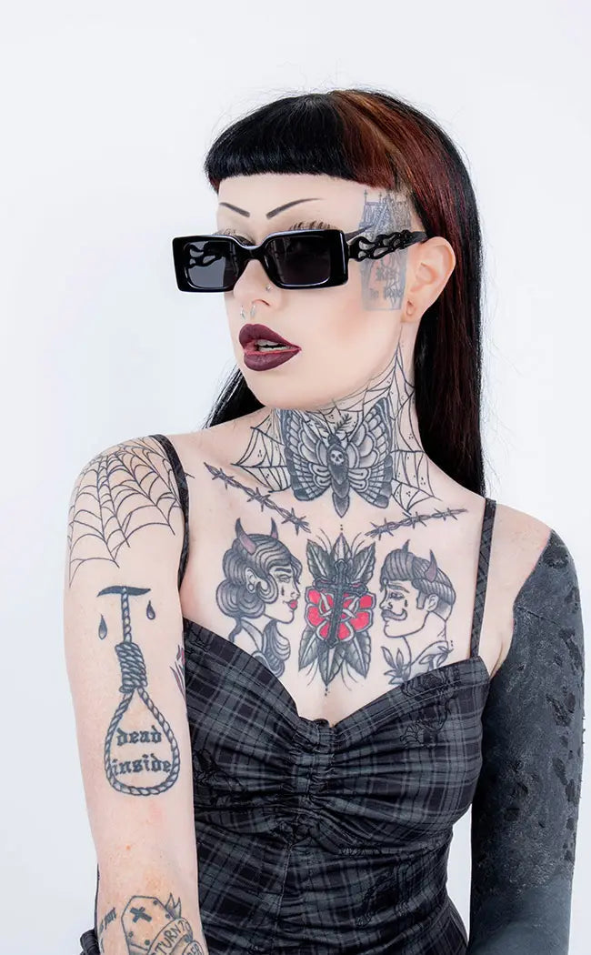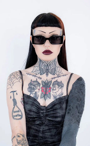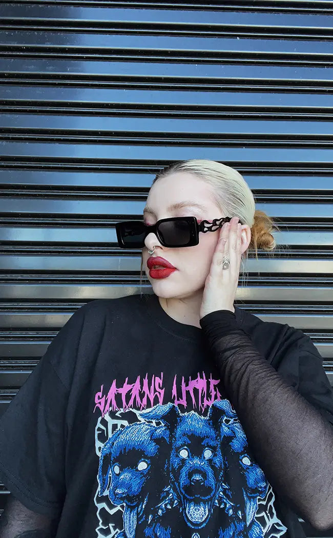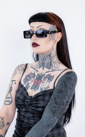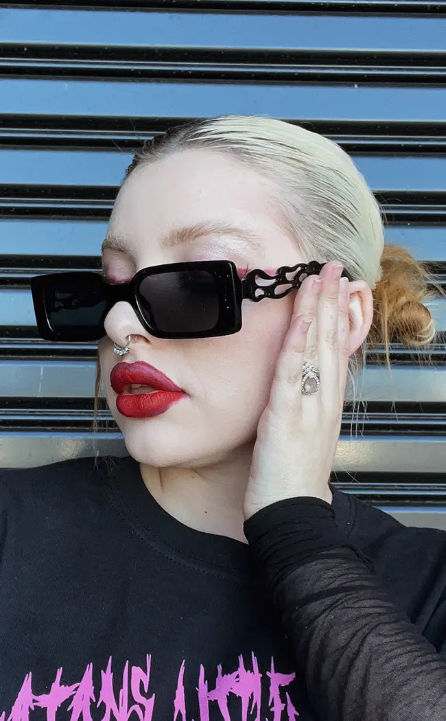 Shade your look from the sun in these Eternal Shadows Sunglasses. Lightweight and menacing, these shades feature abstract arms and rectangle lenses that'll give you the perfect gothic accessory for summer. Throw them on your gorgeous face and take the edge off those summer rays!
