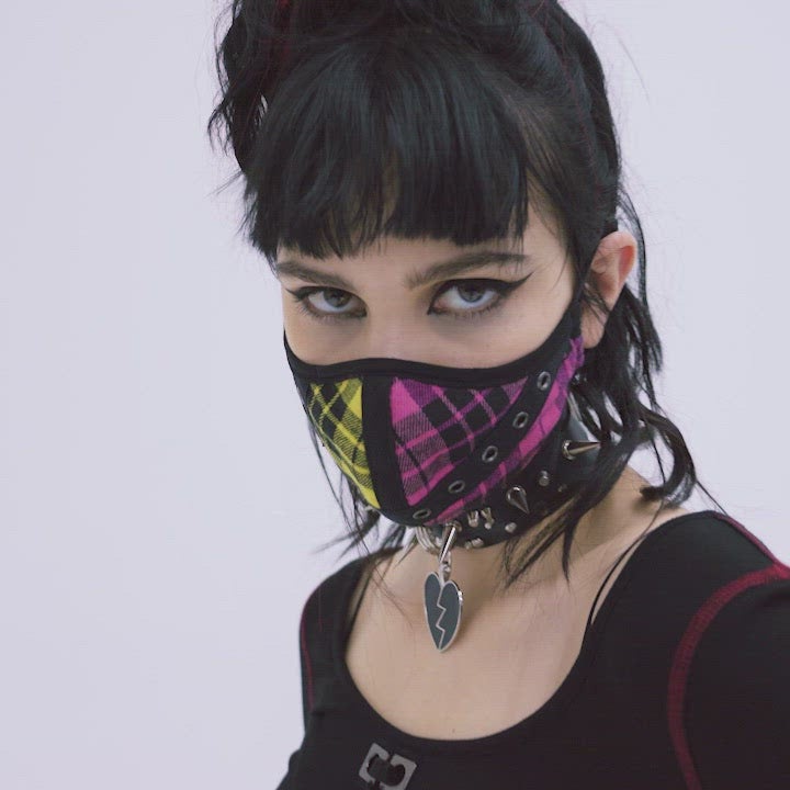 This mask is split into two shocking shades of tartan, topped off with a black band of eyelets.