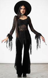 Worship your gorgeous bod in the Faythe Lace Top! This ghostly blouse is made of sheer stretch lace, forming a square neckline, long layered sleeves and a tattered hanky hem.