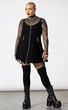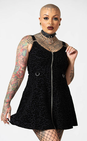 Dress like the cat who got the cream in the Feelin' Purrty Skater Dress! Soft, stretch fabric is flocked with a black-n-black leopard print, forming this cute skater with adjustable shoulder straps and detachable leg straps. Metal hardware like a full-length zip and D rings add an extra punk touch.