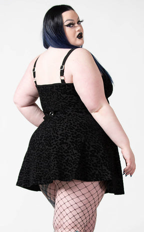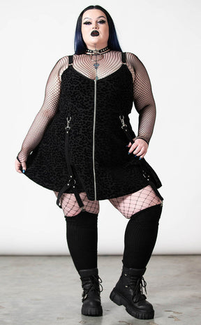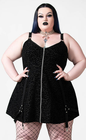 Dress like the cat who got the cream in the Feelin' Purrty Skater Dress! Soft, stretch fabric is flocked with a black-n-black leopard print, forming this cute skater with adjustable shoulder straps and detachable leg straps. Metal hardware like a full-length zip and D rings add an extra punk touch.