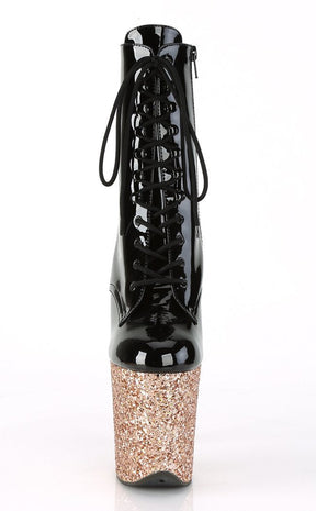 8" (200mm) Heel, 4" (100mm) Platform Lace-Up Front Ankle Boot Featuring Fully Wrapped Glitter Platform Bottom, Inside Zip Closure