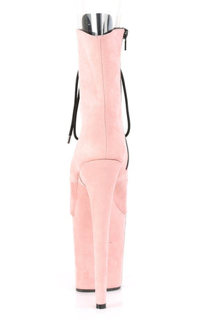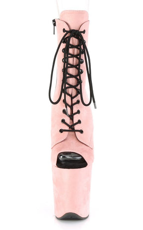 Stand tall, babe! You'll be towering over the crowd in the Flamingo series. These pole-dancing booties feature all over sweet pastel pink faux suede with peep toe front and contrasting black laced up front.