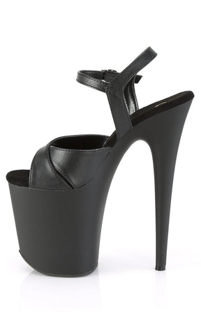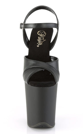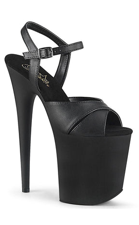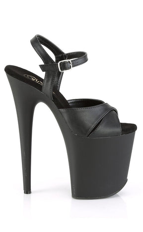 Black vegan pole-dancing shoes with crossover front, faux leather upper and matte black platform.
