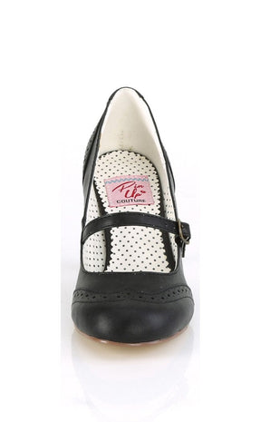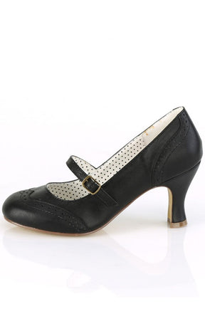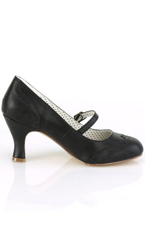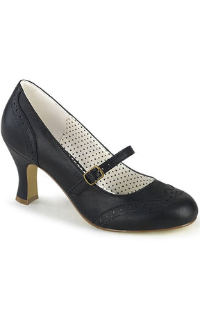 3"" (75mm) black vegan retro look Mary Jane kitten heels with rounded toes feat perforated design.