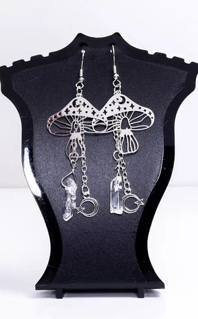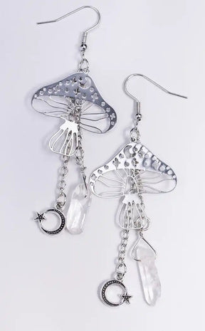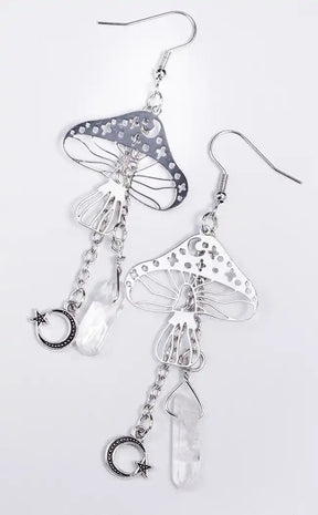 Give some life to your cottagecore fit with these mushroom crystal earrings. These drop earrings feautre lightweight metal mushroom charms and have two chain dangles, one with a raw quartz crystal, and one with a crescent moon charm with star.