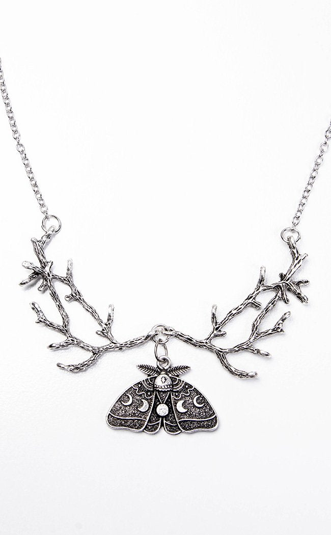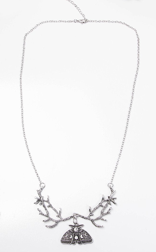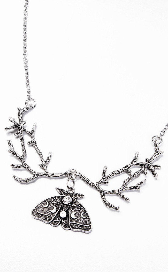 Bring the beauty of nature into your wardrobe with this stunning necklace. The pendant features a lunar moth hanging from twisted tree branches that sit on a delicate chain, securing with a clasp at the back.