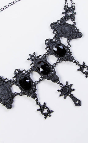 Feel your felicitous future in the Fortune Teller Choker! 5 ornate, antique-look frames connect with delicate chains, 3 of which are adorned with glittering faceted black gems. The same 3 frames also feature hanging openwork charms for that extra touch of gothic elegance.