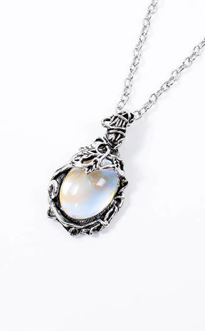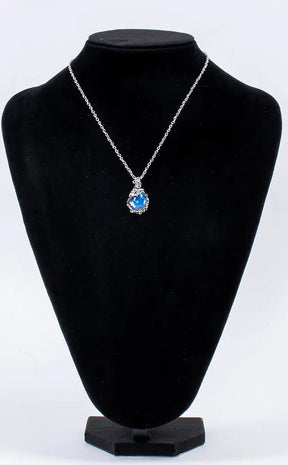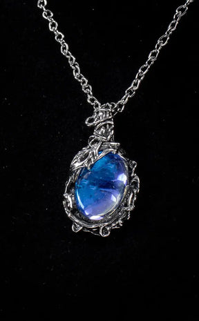 This necklace features an oval-shaped gem that swirls with blues and whites fixed in intricate silver findings.
