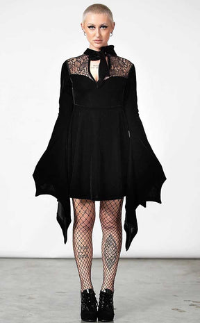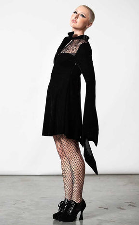 Show off your inner sorceress with the Grimina Velvet Sorvery Dress! Soft, luxe velvet forms the flowing skirt and dramatic waterfall sleeves, cut into a statement batwing shape. The mesh yoke features a keyhole detail and a high collar trimmed with a velvet necktie.