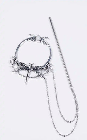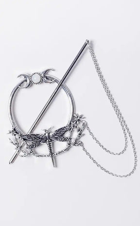 Dripping in details; a gorgeous dragonfly dances amongst the flora of this stunning hair pin. Two chains hang delicately connecting the stick to the pendant, with the finishing trimmings of moons and flora. This alternative hair pin is a cottagecore witches dream!