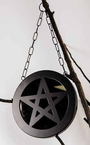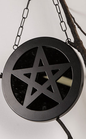 This gorgeous round mirror is enshrouded in matte, black metal, a pentagram crossing over the shining surface. This piece hangs from a bold, thick chain with a ring, making it easy to display around the home or above your altar.