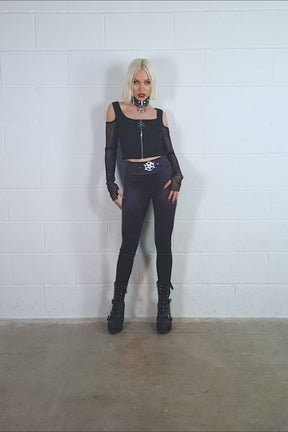 Blow them away with heavy metal in the Hardcore Leggings! Crafted from high shine, stretch fabric, these babies show off yer legs and sit snug on yer bod with a high, wide waistband. The waist features a huge pentagram decal for a simple yet bold touch of heavy metal goodness.