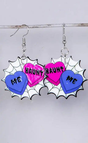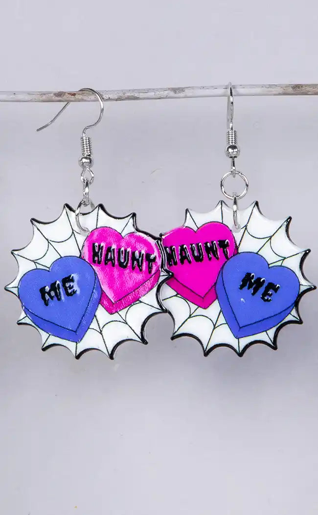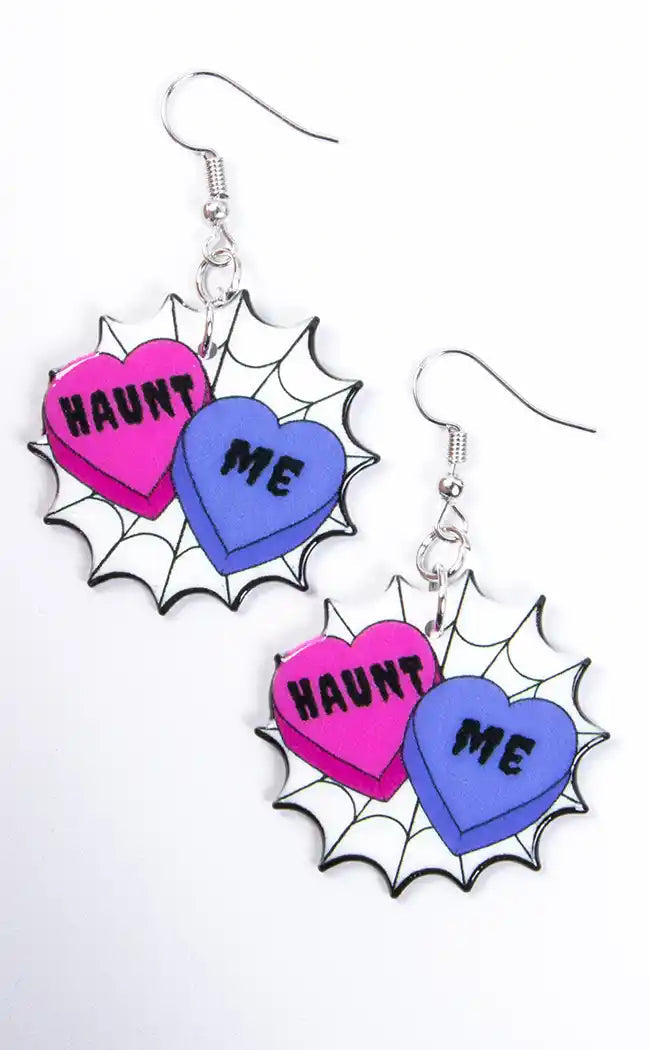 These cute acrylic earrings say it all. Reminiscent of tattoo flash webs and pink and purple candy hearts, they are made from lightweight acrylic and are drop closure.